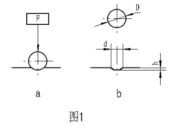 金屬布氏硬度試驗(yàn)系采用一定直徑硬質(zhì)合金球,以規(guī)定試驗(yàn)力壓入被測(cè)材料表面(圖1a)按規(guī)定保持時(shí)間后,卸除試驗(yàn)力,(圖1b)測(cè)量試樣表面的壓痕直徑,以計(jì)算出布氏硬度,并以下式計(jì)算之: